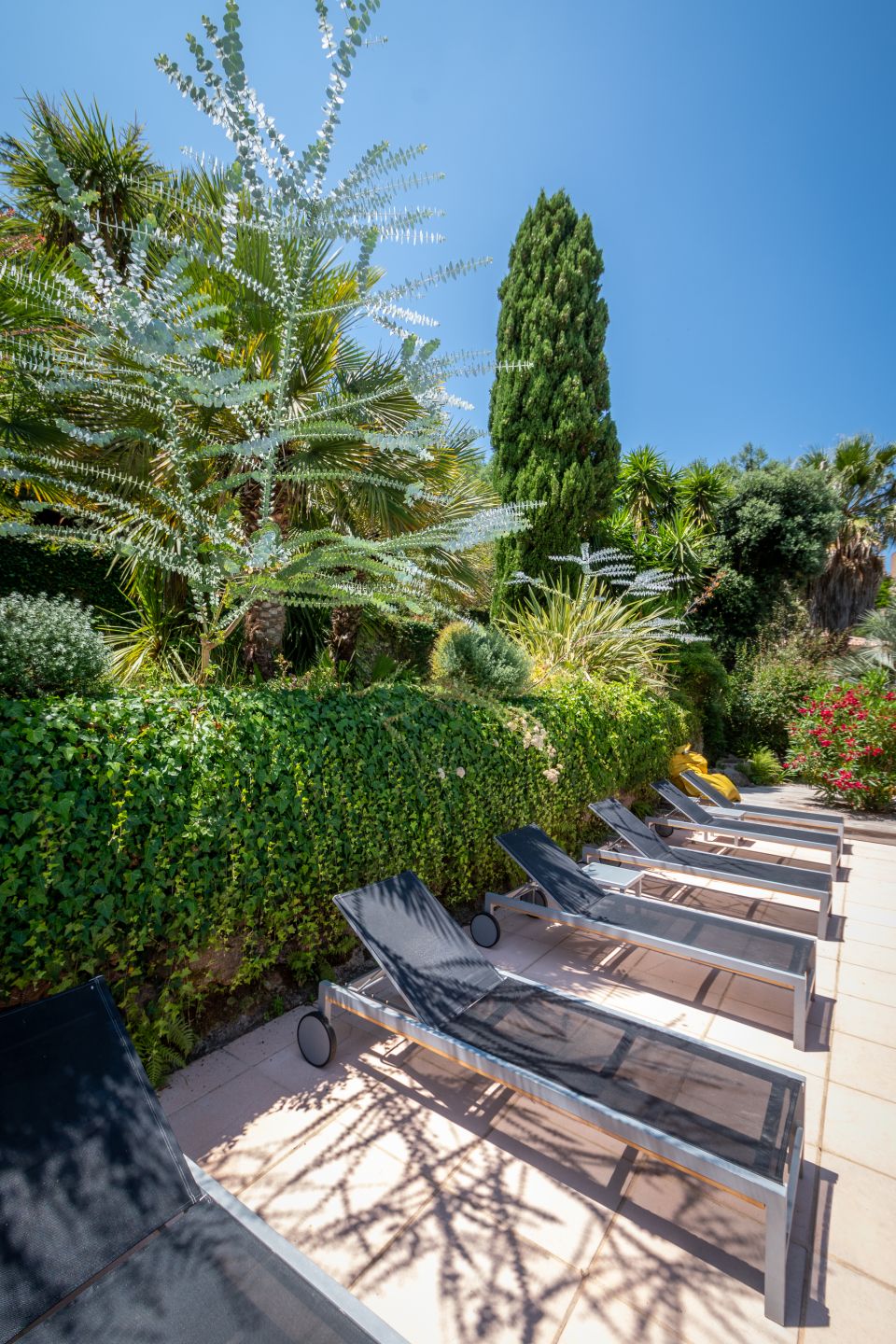 Détente et farniente assurés sur des transats, à l’ombre naturelle des palmiers ou en plein soleil. Chaque détail a été pensé pour votre confort : coussins, serviettes, tables d’appoint pour vos rafraîchissements.